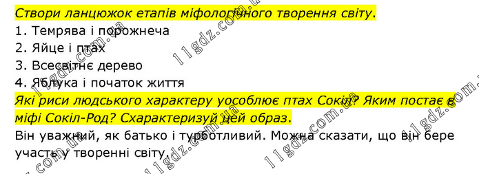 Створи ланцюжок етапів міфологічного творення світу. 1. Темрява і порожнеча 2. Яйце і птах 3. Всесвітнє дерево 4. Яблука і початок життя Які риси людського характеру уособлює птах Сокіл? Яким постає в міфі Сокіл-Род? Схарактеризуй цей образ. Він уважний, як батько і турботливий. Можна сказати, що він бере участь у творенні світу.