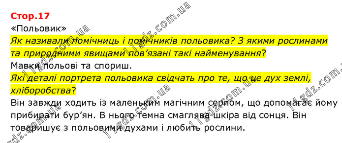 «Польовик» Як називали помічниць і помічників польовика? З якими рослинами та природними явищами пов’язані такі найменування? Мавки польові та спориш. Які деталі портрета польовика свідчать про те, що це дух землі, хліборобства? Він завжди ходить із маленьким магічним серпом, що допомагає йому прибирати бур’ян. В нього темна смаглява шкіра від сонця. Він товаришує з польовими духами і любить рослини.