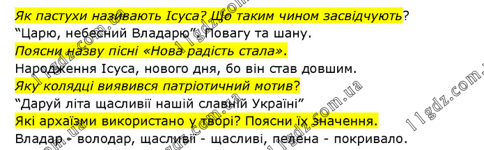 Як пастухи називають Ісуса? Що таким чином засвідчують? “Царю, небесний Владарю”. Повагу та шану. Поясни назву пісні «Нова радість стала». Народження Ісуса, нового дня, бо він став довшим. Яку колядці виявився патріотичний мотив? “Даруй літа щасливії нашій славній Україні” Які архаїзми використано у творі? Поясни їх значення. Владар - володар, щасливії - щасливі, пелена - покривало.