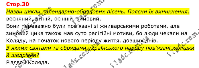 Назви цикли календарно-обрядових пісень. Поясни їх виникнення. весняний, літній, осінній, зимовий. Вони переважно були пов’язані зі жниварськими роботами, але зимовий цикл також мав суто релігійні мотиви, бо люди чекали на Коляду, на початок нового періоду життя, довших днів. З якими святами та обрядами українського народу пов’язані колядки й щедрівки? Різдво і Коляда.