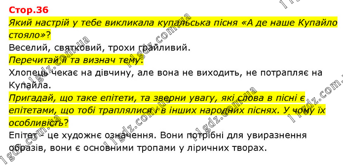 Який настрій у тебе викликала купальська пісня «А де наше Купайло стояло»? Веселий, святковий, трохи грайливий. Перечитай її та визнач тему. Хлопець чекає на дівчину, але вона не виходить, не потрапляє на Купайла. Пригадай, що таке епітети, та зверни увагу, які слова в пісні є епітетами, що тобі траплялися і в інших народних піснях. У чому їх особливість? Епітет - це художнє означення. Вони потрібні для увиразнення образів, вони є основними тропами у ліричних творах.