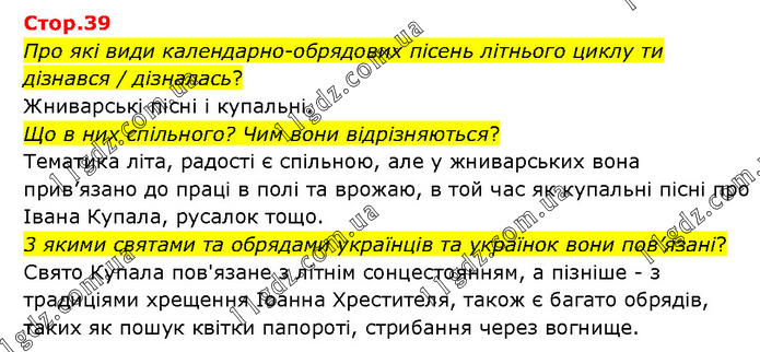 Про які види календарно-обрядових пісень літнього циклу ти дізнався / дізналась? Жниварські пісні і купальні. Що в них спільного? Чим вони відрізняються? Тематика літа, радості є спільною, але у жниварських вона прив’язано до праці в полі та врожаю, в той час як купальні пісні про Івана Купала, русалок тощо. 3 якими святами та обрядами українців та українок вони пов’язані? Свято Купала пов'язане з літнім сонцестоянням, а пізніше - з традиціями хрещення Іоанна Хрестителя, також є багато обрядів, таких як пошук квітки папороті, стрибання через вогнище.