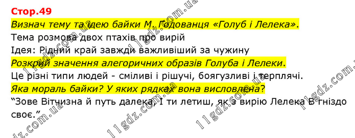 Визнач тему та ідею байки М. Годованця «Голуб і Лелека». Тема розмова двох птахів про вирій Ідея: Рідний край завжди важливіший за чужину Розкрий значення алегоричних образів Голуба і Лелеки. Це різні типи людей - сміливі і рішучі, боягузливі і терплячі. Яка мораль байки? У яких рядках вона висловлена? “Зове Вітчизна й путь далека, І ти летиш, як з вирію Лелека В гніздо своє.”