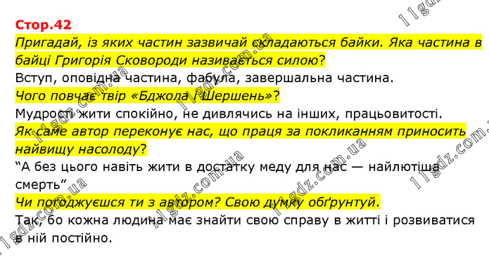 Пригадай, із яких частин зазвичай складаються байки. Яка частина в байці Григорія Сковороди називається силою? Вступ, оповідна частина, фабула, завершальна частина. Чого повчає твір «Бджола і Шершень»? Мудрості жити спокійно, не дивлячись на інших, працьовитості. Як саме автор переконує нас, що праця за покликанням приносить найвищу насолоду? “А без цього навіть жити в достатку меду для нас — найлютіша смерть” Чи погоджуєшся ти з автором? Свою думку обґрунтуй. Так, бо кожна людина має знайти свою справу в житті і розвиватися в ній постійно.