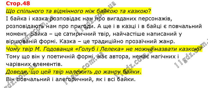 Що спільного та відмінного між байкою та казкою? І байка і казка розповідає нам про вигаданих персонажів, розповідають нам про пригоди. А ще і в казці і в байці є повчальний момент. Байка – це сатиричний твір, найчастіше написаний у віршованій формі. Казка – це традиційно прозаїчний жанр. Чому твір М. Годованця «Голуб і Лелека» не можна назвати казкою? Тому що він у поетичній формі, має автора, немає магічних і чарівних елементів. Доведи, що цей твір належить до жанру байки. Він повчальний і алегоричний, як і всі байки.