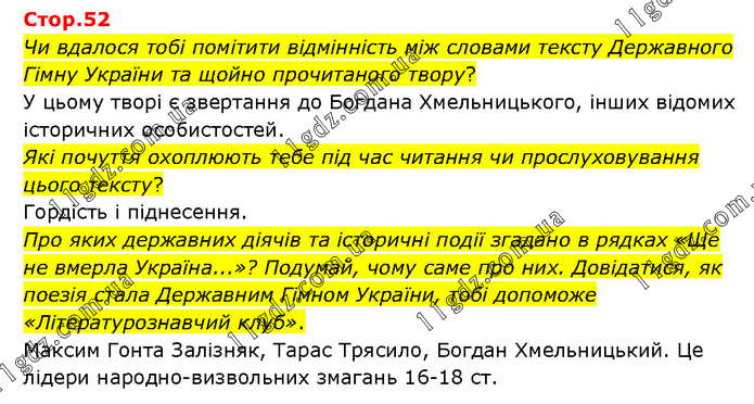 Чи вдалося тобі помітити відмінність між словами тексту Державного Гімну України та щойно прочитаного твору? У цьому творі є звертання до Богдана Хмельницького, інших відомих історичних особистостей. Які почуття охоплюють тебе під час читання чи прослуховування цього тексту? Гордість і піднесення. Про яких державних діячів та історичні події згадано в рядках «Ще не вмерла Україна...»? Подумай, чому саме про них. Довідатися, як поезія стала Державним Гімном України, тобі допоможе «Літературознавчий клуб». Максим Гонта Залізняк, Тарас Трясило, Богдан Хмельницький. Це лідери народно-визвольних змагань 16-18 ст.
