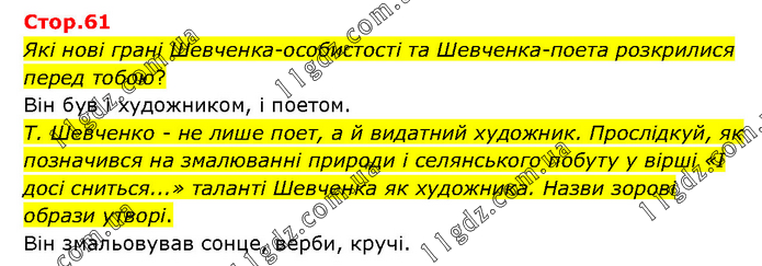 Які нові грані Шевченка-особистості та Шевченка-поета розкрилися перед тобою? Він був і художником, і поетом. Т. Шевченко - не лише поет, а й видатний художник. Прослідкуй, як позначився на змалюванні природи і селянського побуту у вірші «І досі сниться...» таланті Шевченка як художника. Назви зорові образи утворі. Він змальовував сонце, верби, кручі.