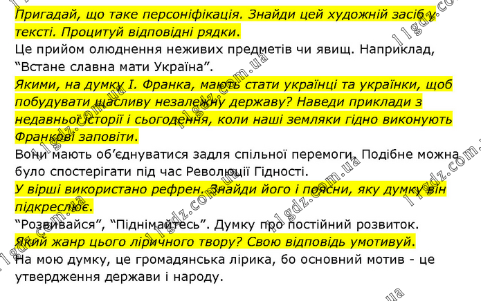 Пригадай, що таке персоніфікація. Знайди цей художній засіб у тексті. Процитуй відповідні рядки. Це прийом олюднення неживих предметів чи явищ. Наприклад, “Встане славна мати Україна”. Якими, на думку І. Франка, мають стати українці та українки, щоб побудувати щасливу незалежну державу? Наведи приклади з недавньої історії і сьогодення, коли наші земляки гідно виконують Франкові заповіти. Вони мають об’єднуватися задля спільної перемоги. Подібне можна було спостерігати під час Революції Гідності. У вірші використано рефрен. Знайди його і поясни, яку думку він підкреслює. “Розвивайся”, “Піднімайтесь”. Думку про постійний розвиток. Який жанр цього ліричного твору? Свою відповідь умотивуй. На мою думку, це громадянська лірика, бо основний мотив - це утвердження держави і народу.