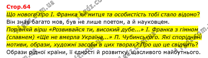 Що нового про І. Франка як митця та особистість тобі стало відомо? Він знав багато мов, був не лише поетом, а й науковцем. Порівняй вірш «Розвивайся ти, високий дубе...» І. Франка з гімном (славнем) «Ще не вмерла Україна...» П. Чубинського. Які споріднені мотиви, образи, художні засоби в цих творах? Про що це свідчить? Образи рідної країни, її єдності й розвитку, щасливого майбутнього.
