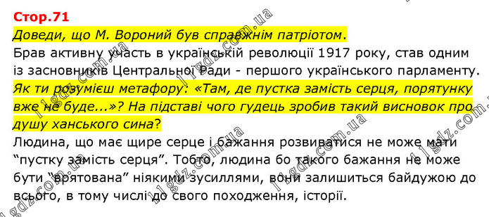 Доведи, що М. Вороний був справжнім патріотом. Брав активну участь в українській революції 1917 року, став одним із засновників Центральної Ради - першого українського парламенту. Як ти розумієш метафору: «Там, де пустка замість серця, порятунку вже не буде...»? На підставі чого гудець зробив такий висновок про душу ханського сина? Людина, що має щире серце і бажання розвиватися не може мати “пустку замість серця”. Тобто, людина бо такого бажання не може бути “врятована” ніякими зусиллями, вони залишиться байдужою до всього, в тому числі до свого походження, історії.