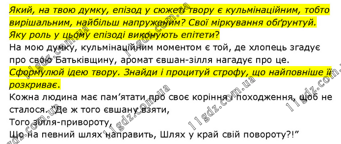 Який, на твою думку, епізод у сюжеті твору є кульмінаційним, тобто вирішальним, найбільш напруженим? Свої міркування обґрунтуй. Яку роль у цьому епізоді виконують епітети? На мою думку, кульмінаційним моментом є той, де хлопець згадує про свою Батьківщину, аромат євшан-зілля нагадує про це. Сформулюй ідею твору. Знайди і процитуй строфу, що найповніше її розкриває. Кожна людина має пам’ятати про своє коріння і походження, щоб не сталося. “Де ж того євшану взяти, Того зілля-привороту, Що на певний шлях направить, Шлях у край свій повороту?!”