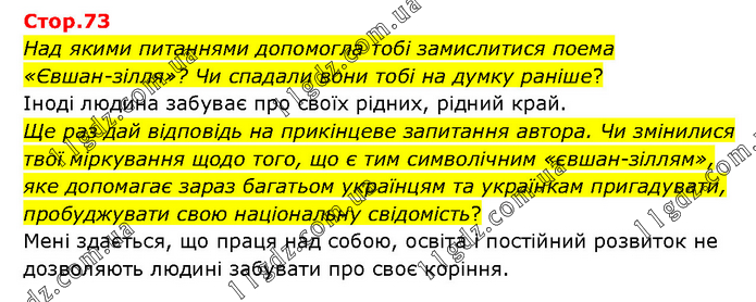 Над якими питаннями допомогла тобі замислитися поема «Євшан-зілля»? Чи спадали вони тобі на думку раніше? Іноді людина забуває про своїх рідних, рідний край. Ще раз дай відповідь на прикінцеве запитання автора. Чи змінилися твої міркування щодо того, що є тим символічним «євшан-зіллям», яке допомагає зараз багатьом українцям та українкам пригадувати, пробуджувати свою національну свідомість? Мені здається, що праця над собою, освіта і постійний розвиток не дозволяють людині забувати про своє коріння.