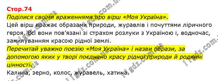 Поділися своїми враженнями про вірш «Моя Україна». Цей вірш вражає образами природи, журавлів і почуттями ліричного героя. Всі вони пов’язані зі страхом розлуки з Україною і, водночас, замилуванням красою рідної землі. Перечитай уважно поезію «Моя Україна» і назви образи, за допомогою яких у творі поєднано красу рідної природи й родинні цінності. Калина, зерно, колос, журавель, хатина.