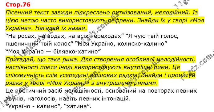 Пісенний текст завжди підкреслено ритмізований, мелодійний. Із цією метою часто використовують рефрени. Знайди їх у творі «Моя Україна». Нагадай їх назви. “На росах, на водах, на всіх переходах” “Я чую твій голос, пшеничний твій колос” “Моя Україно, колиско-калино” “Моя Україно — білявко-хатино” Пригадай, що таке рима. Для створення особливої мелодійності, наспівності поети іноді використовують внутрішні рими. Це співзвучність слів усередині віршових рядків. Знайди і процитуй рядки у творі «Моя Україна» з внутрішніми римами. Це поетичний засіб мелодійності, оснований на повторах певних звуків, наголосів, навіть певних інтонацій. “Україно - калино”, “хатина”.