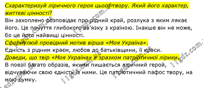 Схарактеризуй ліричного героя цього твору. Який його характер, життєві цінності? Він захоплено розповідає про рідний край, розлука з яким лякає його. Це почуття глибокого зв’язку з країною. Інакше він не може, бо це його найвищі цінності. Сформулюй провідний мотив вірша «Моя Україна». Єдність з рідним краєм, любов до батьківщини, її краси. Доведи, що твір «Моя Україна» є зразком патріотичної лірики. В поезії багато образів, якими пишається ліричний герой, відчуваючи свою єдність із ними. Це патріотичний пафос твору, на мою думку.