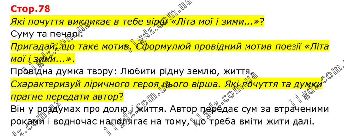 Які почуття викликає в тебе вірш «Літа мої і зими...»? Суму та печалі. Пригадай, що таке мотив. Сформулюй провідний мотив поезії «Літа мої і зими...». Провідна думка твору: Любити рідну землю, життя. Схарактеризуй ліричного героя цього вірша. Які почуття та думки прагне передати автор? Він у роздумах про долю і життя. Автор передає сум за втраченими роками і водночас наполягає на тому, що треба вміти жити далі.