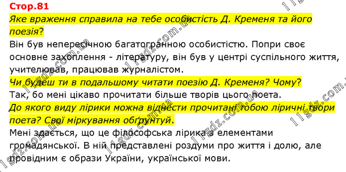 Яке враження справила на тебе особистість Д. Кременя та його поезія? Він був непересічною багатогранною особистістю. Попри своє основне захоплення - літературу, він був у центрі суспільного життя, учителював, працював журналістом. Чи будеш ти в подальшому читати поезію Д. Кременя? Чому? Так, бо мені цікаво прочитати більше творів цього поета. До якого виду лірики можна віднести прочитані тобою ліричні твори поета? Свої міркування обґрунтуй. Мені здається, що це філософська лірика з елементами громадянської. В ній представлені роздуми про життя і долю, але провідним є образи України, української мови.