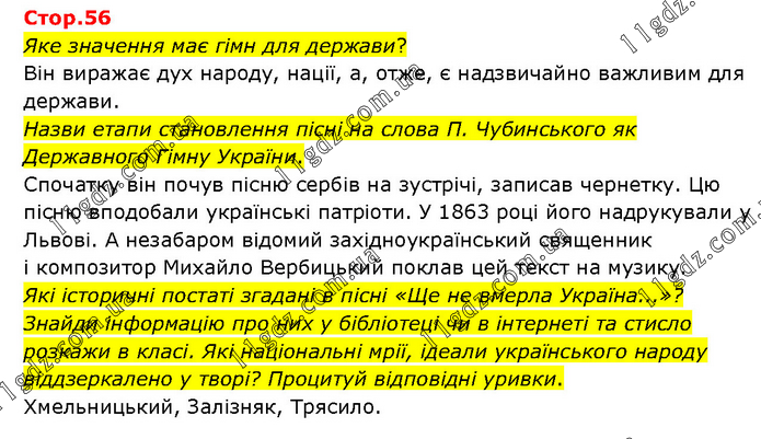 Яке значення має гімн для держави? Він виражає дух народу, нації, а, отже, є надзвичайно важливим для держави. Назви етапи становлення пісні на слова П. Чубинського як Державного Гімну України. Спочатку він почув пісню сербів на зустрічі, записав чернетку. Цю пісню вподобали українські патріоти. У 1863 році його надрукували у Львові. А незабаром відомий західноукраїнський священник і композитор Михайло Вербицький поклав цей текст на музику. Які історичні постаті згадані в пісні «Ще не вмерла Україна...»? Знайди інформацію про них у бібліотеці чи в інтернеті та стисло розкажи в класі. Які національні мрії, ідеали українського народу віддзеркалено у творі? Процитуй відповідні уривки. Хмельницький, Залізняк, Трясило.