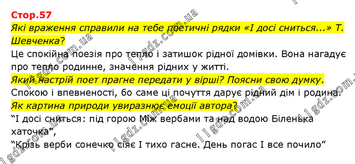 Які враження справили на тебе поетичні рядки «І досі сниться...» Т. Шевченка? Це спокійна поезія про тепло і затишок рідної домівки. Вона нагадує про тепло родинне, значення рідних у житті. Який настрій поет прагне передати у вірші? Поясни свою думку. Спокою і впевненості, бо саме ці почуття дарує рідний дім і родина. Як картина природи увиразнює емоції автора? “І досі сниться: під горою Між вербами та над водою Біленька хаточка”, “Крізь верби сонечко сіяє І тихо гасне. День погас І все почило”