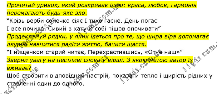 Прочитай уривок, який розкриває ідею: краса, любов, гармонія перемагають будь-яке зло. “Крізь верби сонечко сіяє І тихо гасне. День погас І все почило. Сивий в хату Й собі пішов опочивати” Продекламуй рядки, у яких ідеться про те, що щира віра допомагає людині навчитися радіти життю, бачити щастя. “І нищечком старий читає, Перехрестившись, «Отче наш»” Зверни увагу на пестливі слова у вірші. З якою метою автор їх вживає? Щоб створити відповідний настрій, показати тепло і щирість рідних у ставленні один до одного.