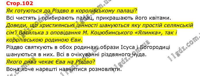 Як готуються до Різдво в королівському палаці? Всі чистять і прибирають палац, прикрашають його квітами. Доведи, що християнські цінності шануються яку простій селянській сім’ї Василька з оповідання М. Коцюбинського «Ялинка», так і королівською родиною Єви. Різдво святкують в обох родинах, образи Ісуса і Богородиці шануються в них. Всі в очікуванні різдвяного чуда. Якого дива чекає Єва на Різдво? Вона хоче нарешті навчитися розмовляти.