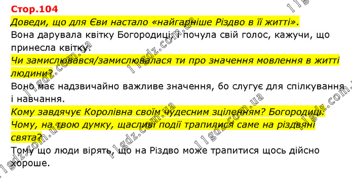Доведи, що для Єви настало «найгарніше Різдво в її житті». Вона дарувала квітку Богородиці, і почула свій голос, кажучи, що принесла квітку. Чи замислювався/замислювалася ти про значення мовлення в житті людини? Воно має надзвичайно важливе значення, бо слугує для спілкування і навчання. Кому завдячує Королівна своїм чудесним зціленням? Богородиці. Чому, на твою думку, щасливі події трапилися саме на різдвяні свята? Тому що люди вірять, що на Різдво може трапитися щось дійсно хороше.