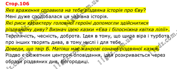 Яке враження справила на тебе різдвяна історія про Єву? Мені дуже сподобалася ця чарівна історія. Які риси характеру головної героїні допомогли здійснитися різдвяному диву? Визнач ідею казки «Єва і білосніжна квітка лілії». Терплячість, чесність, доброта. Ідея в тому, що щира віра і турбота про інших творять дива, в тому числі і для тебе. Доведи, що твір Б. Матіяш має жанрові ознаки різдвяної казки. Різдво є сюжетним центром оповідання, ідея розкривається через образи різдвяних див, Богородиці.