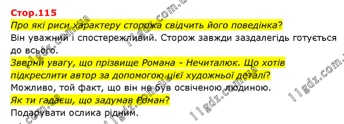 Про які риси характеру сторожа свідчить його поведінка? Він уважний і спостережливий. Сторож завжди заздалегідь готується до всього. Зверни увагу, що прізвище Романа - Нечиталюк. Що хотів підкреслити автор за допомогою цієї художньої деталі? Можливо, той факт, що він не був освіченою людиною. Як ти гадаєш, що задумав Роман? Подарувати ослика рідним.