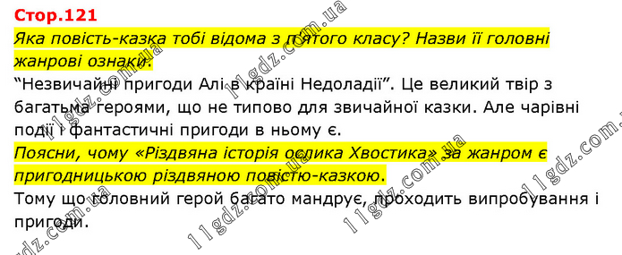 Яка повість-казка тобі відома з п'ятого класу? Назви її головні жанрові ознаки. “Незвичайні пригоди Алі в країні Недоладії”. Це великий твір з багатьма героями, що не типово для звичайної казки. Але чарівні події і фантастичні пригоди в ньому є. Поясни, чому «Різдвяна історія ослика Хвостика» за жанром є пригодницькою різдвяною повістю-казкою. Тому що головний герой багато мандрує, проходить випробування і пригоди.