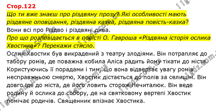 Що ти вже знаєш про різдвяну прозу? Які особливості мають різдвяне оповідання, різдвяна казка, різдвяна повість-казка? Вони всі про Різдво і різдвяні дива. Про що розповідається в повісті О. Гавроша «Різдвяна історія ослика Хвостика»? Перекажи стисло. Ослик Хвостик був викрадений з театру злодіями. Він потрапляє до табору ромів, де поважна кобила Аліса радить йому тікати до міста. Користуючись її порадами і тим, що вона відвертає увагу ромів несправжньою смертю, Хвостик дістається до полів за селищім. Він довго іде до міста, де його ловить сторож Нечиталюк. Він веде родину й ослика до собору, де на святковому вертепі Хвостик помічає родичів. Священник впізнає Хвостика.