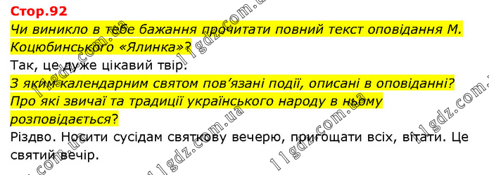 Чи виникло в тебе бажання прочитати повний текст оповідання М. Коцюбинського «Ялинка»? Так, це дуже цікавий твір. З яким календарним святом пов’язані події, описані в оповіданні? Про які звичаї та традиції українського народу в ньому розповідається? Різдво. Носити сусідам святкову вечерю, пригощати всіх, вітати. Це святий вечір.