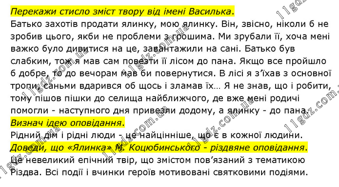 Перекажи стисло зміст твору від імені Василька. Батько захотів продати ялинку, мою ялинку. Він, звісно, ніколи б не зробив цього, якби не проблеми з грошима. Ми зрубали її, хоча мені важко було дивитися на це, завантажили на сані. Батько був слабким, тож я мав сам повезти її лісом до пана. Якщо все пройшло б добре, то до вечорам мав би повернутися. В лісі я з’їхав з основної тропи, саньми вдарився об щось і зламав їх… Я не знав, що і робити, тому пішов пішки до селища найближчого, де вже мені родичі помогли - наступного дня привезли додому, а ялинку - до пана. Визнач ідею оповідання. Рідний дім і рідні люди - це найцінніше, що є в кожної людини. Доведи, що «Ялинка» М. Коцюбинського - різдвяне оповідання. Це невеликий епічний твір, що змістом пов’язаний з тематикою Різдва. Всі події і вчинки героїв мотивовані святковими подіями.
