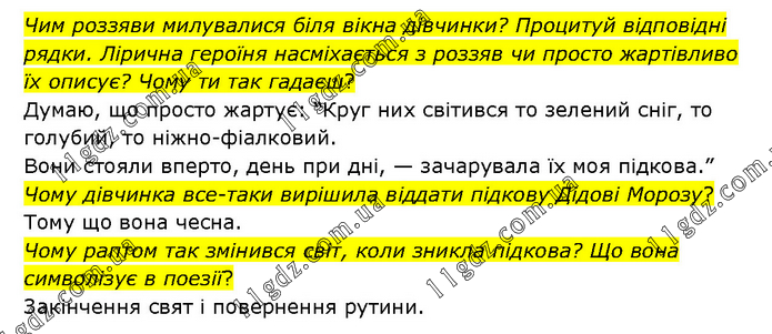 Чим роззяви милувалися біля вікна дівчинки? Процитуй відповідні рядки. Лірична героїня насміхається з роззяв чи просто жартівливо їх описує? Чому ти так гадаєш? Думаю, що просто жартує: “Круг них світився то зелений сніг, то голубий, то ніжно-фіалковий. Вони стояли вперто, день при дні, — зачарувала їх моя підкова.” Чому дівчинка все-таки вирішила віддати підкову Дідові Морозу? Тому що вона чесна. Чому раптом так змінився світ, коли зникла підкова? Що вона символізує в поезії? Закінчення свят і повернення рутини.