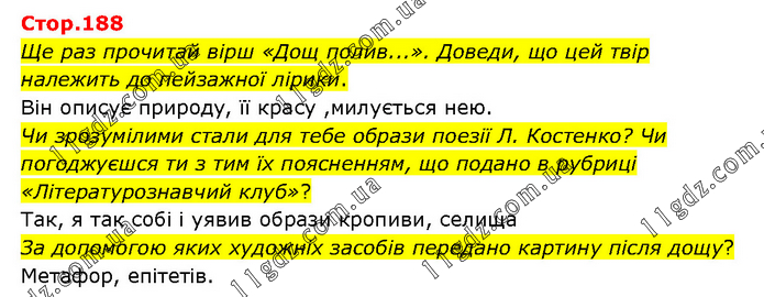 Ще раз прочитай вірш «Дощ полив...». Доведи, що цей твір належить до пейзажної лірики. Він описує природу, її красу ,милується нею. Чи зрозумілими стали для тебе образи поезії Л. Костенко? Чи погоджуєшся ти з тим їх поясненням, що подано в рубриці «Літературознавчий клуб»? Так, я так собі і уявив образи кропиви, селища За допомогою яких художніх засобів передано картину після дощу? Метафор, епітетів.