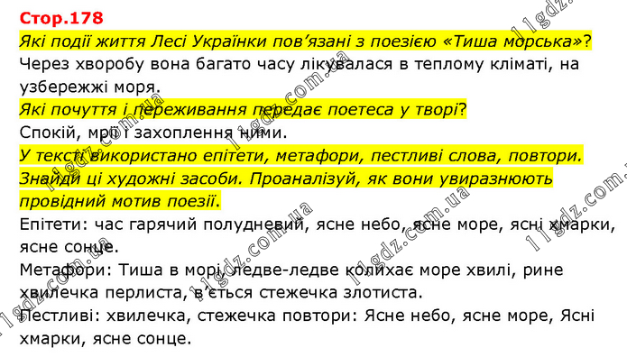 Які події життя Лесі Українки пов’язані з поезією «Тиша морська»? Через хворобу вона багато часу лікувалася в теплому кліматі, на узбережжі моря. Які почуття і переживання передає поетеса у творі? Спокій, мрії і захоплення ними. У тексті використано епітети, метафори, пестливі слова, повтори. Знайди ці художні засоби. Проаналізуй, як вони увиразнюють провідний мотив поезії. Епітети: час гарячий полудневий, ясне небо, ясне море, ясні хмарки, ясне сонце. Метафори: Тиша в морі, ледве-ледве колихає море хвилі, рине хвилечка перлиста, в’ється стежечка злотиста. Пестливі: хвилечка, стежечка повтори: Ясне небо, ясне море, Ясні хмарки, ясне сонце.