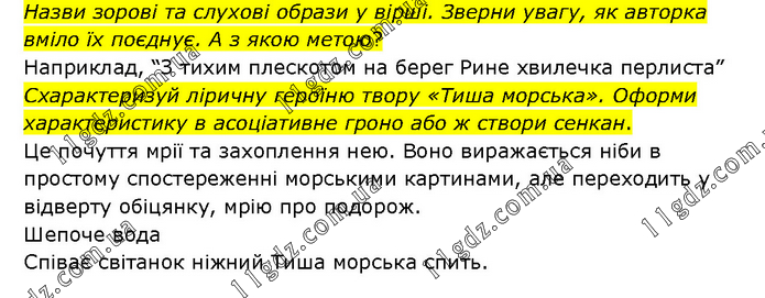 Назви зорові та слухові образи у вірші. Зверни увагу, як авторка вміло їх поєднує. А з якою метою? Наприклад, “З тихим плескотом на берег Рине хвилечка перлиста” Схарактеризуй ліричну героїню твору «Тиша морська». Оформи характеристику в асоціативне гроно або ж створи сенкан. Це почуття мрії та захоплення нею. Воно виражається ніби в простому спостереженні морськими картинами, але переходить у відверту обіцянку, мрію про подорож. Шепоче вода Співає світанок ніжний Тиша морська спить.