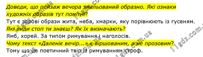 Доведи, що пейзаж вечора змальований образно. Які ознаки художніх образів тут помітні? Тут є зорові образи жита, неба, хмарки, яку порівнюють із гусеням. Які види стоп ти знаєш? Як їх визначають? Ямб, хорей. За типом римування і наголосів. Чому текст «Даленіє вечір...» є віршованим, а не прозовим? Тому що це поетичний твір із римуванням строф.