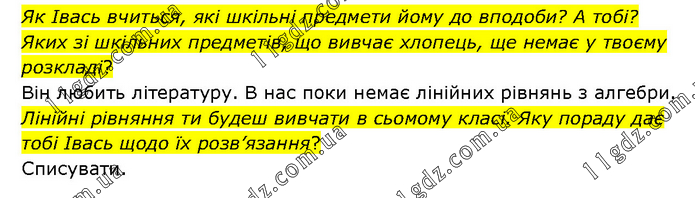 Як Івась вчиться, які шкільні предмети йому до вподоби? А тобі? Яких зі шкільних предметів, що вивчає хлопець, ще немає у твоєму розкладі? Він любить літературу. В нас поки немає лінійних рівнянь з алгебри. Лінійні рівняння ти будеш вивчати в сьомому класі. Яку пораду дає тобі Івась щодо їх розв’язання? Списувати.