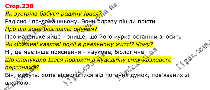 Як зустріла бабуся родину Івася? Радісно і по-домашньому. Вони одразу пішли поїсти Про що вона розповіла онукам? Про маленьке яйце - знище, що його курка останнім зносить Чи можливі казкові події в реальному житті? Чому? Ні, це має інше пояснення - наукове, біологічне. Що спонукало Івася повірити в чудодійну силу казкового персонажа? Він, мабуть, хотів відволіктися від поганих думок, пов’язаних зі школою.