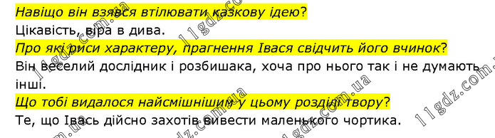 Навіщо він взявся втілювати казкову ідею? Цікавість, віра в дива. Про які риси характеру, прагнення Івася свідчить його вчинок? Він веселий дослідник і розбишака, хоча про нього так і не думають інші. Що тобі видалося найсмішнішим у цьому розділі твору? Те, що Івась дійсно захотів вивести маленького чортика.
