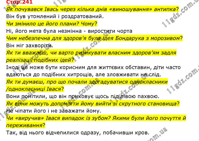 Як почувався Івась через кілька днів «виношування» антипка? Він був утомлений і роздратований. Чи змінило це його плани? Чому? Ні, його мета була незмінна - виростити чорта Чим небезпечна для здоров’я була ідея Бондарука з морозивом? Він міг захворіти. Як ти вважаєш, чи варто ризикувати власним здоров’ям задля реалізації подібних ідей? Іноді це може бути корисним для життєвих обставин, діти часто вдаються до подібних хитрощів, але зловживати не слід. Як ти думаєш, про що почали здогадуватися однокласники /однокласниці Івася? Вони помітили, що він приховує щось під лівою пахвою. Як вони можуть допомогти йому вийти зі скрутного становища? Не чіпати його і не заважати йому. Чи «виручив» Івася випадок із зубом? Якими були його почуття й переживання? Так, від нього відчепилися одразу, побачивши кров.