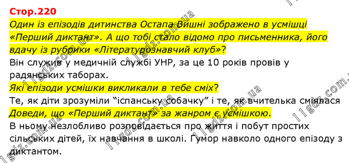 Один із епізодів дитинства Остапа Вишні зображено в усмішці «Перший диктант». А що тобі стало відомо про письменника, його вдачу із рубрики «Літературознавчий клуб»? Він служив у медичній службі УНР, за це 10 років провів у радянських таборах. Які епізоди усмішки викликали в тебе сміх? Те, як діти зрозуміли “іспанську собачку” і те, як вчителька сміялася Доведи, що «Перший диктант» за жанром є усмішкою. В ньому незлобливо розповідається про життя і побут простих сільських дітей, їх навчання в школі. Гумор навколо одного епізоду з диктантом.