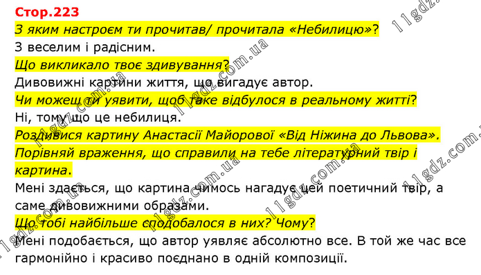 З яким настроєм ти прочитав/ прочитала «Небилицю»? З веселим і радісним. Що викликало твоє здивування? Дивовижні картини життя, що вигадує автор. Чи можеш ти уявити, щоб таке відбулося в реальному житті? Ні, тому що це небилиця. Роздивися картину Анастасії Майорової «Від Ніжина до Львова». Порівняй враження, що справили на тебе літературний твір і картина. Мені здається, що картина чимось нагадує цей поетичний твір, а саме дивовижними образами. Що тобі найбільше сподобалося в них? Чому? Мені подобається, що автор уявляє абсолютно все. В той же час все гармонійно і красиво поєднано в одній композиції.