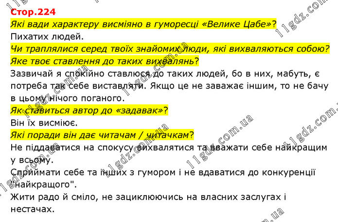 Які вади характеру висміяно в гуморесці «Велике Цабе»? Пихатих людей. Чи траплялися серед твоїх знайомих люди, які вихваляються собою? Яке твоє ставлення до таких вихвалянь? Зазвичай я спокійно ставлюся до таких людей, бо в них, мабуть, є потреба так себе виставляти. Якщо це не заважає іншим, то не бачу в цьому нічого поганого. Як ставиться автор до «задавак»? Він їх висміює. Які поради він дає читачам / читачкам? Не піддаватися на спокусу вихвалятися та вважати себе найкращим у всьому. Сприймати себе та інших з гумором і не вдаватися до конкуренції "найкращого". Жити радо й сміло, не зациклюючись на власних заслугах і нестачах.