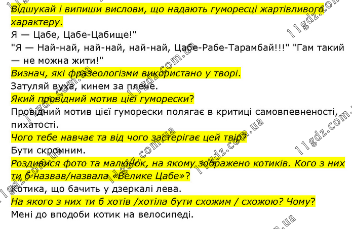Відшукай і випиши вислови, що надають гуморесці жартівливого характеру. Я — Цабе, Цабе-Цабище!" "Я — Най-най, най-най, най-най, Цабе-Рабе-Тарамбай!!!" "Гам такий — не можна жити!" Визнач, які фразеологізми використано у творі. Затуляй вуха, кинем за плече. Який провідний мотив цієї гуморески? Провідний мотив цієї гуморески полягає в критиці самовпевненості, пихатості. Чого тебе навчає та від чого застерігає цей твір? Бути скромним. Роздивися фото та малюнок, на якому зображено котиків. Кого з них ти б назвав/назвала «Велике Цабе»? Котика, що бачить у дзеркалі лева. На якого з них ти б хотів /хотіла бути схожим / схожою? Чому? Мені до вподоби котик на велосипеді.