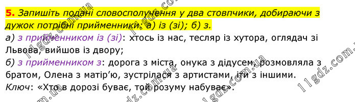 Запишіть подані словосполучення у два стовпчики, добираючи з дужок потрібні прийменники: а) із (зі); б) з. а) з прийменником із (зі): хтось із нас, тесляр із хутора, оглядач зі Львова, вийшов із двору; б) з прийменником з: дорога з міста, онука з дідусем, розмовляла з братом, Олена з матір’ю, зустрілася з артистами, іти з іншими. Ключ: «Хто в дорозі буває, той розуму набуває».