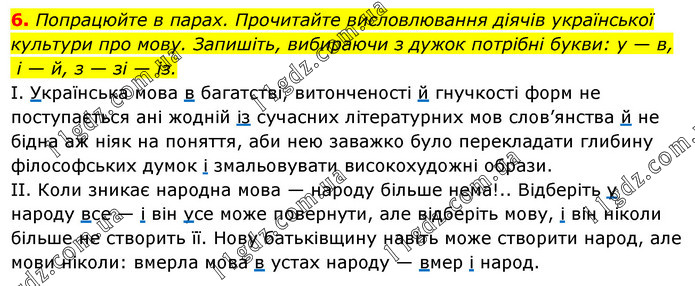 Попрацюйте в парах. Прочитайте висловлювання діячів української культури про мову. Запишіть, вибираючи з дужок потрібні букви: у — в, і — й, з — зі — із. І. Українська мова в багатстві, витонченості й гнучкості форм не поступається ані жодній із сучасних літературних мов слов’янства й не бідна аж ніяк на поняття, аби нею заважко було перекладати глибину філософських думок і змальовувати високохудожні образи. II. Коли зникає народна мова — народу більше нема!.. Відберіть у народу все — і він усе може повернути, але відберіть мову, і він ніколи більше не створить її. Нову батьківщину навіть може створити народ, але мови ніколи: вмерла мова в устах народу — вмер і народ.
