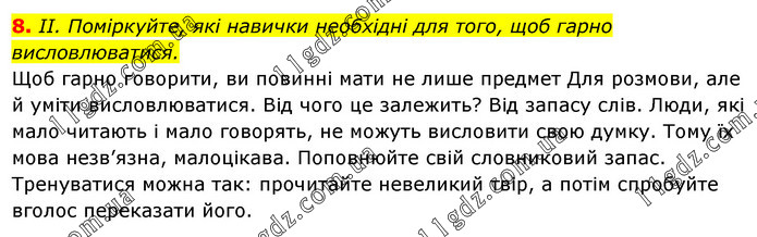 ІІ. Поміркуйте, які навички необхідні для того, щоб гарно висловлюватися. Щоб гарно говорити, ви повинні мати не лише предмет Для розмови, але й уміти висловлюватися. Від чого це залежить? Від запасу слів. Люди, які мало читають і мало говорять, не можуть висловити свою думку. Тому їх мова незв’язна, малоцікава. Поповнюйте свій словниковий запас. Тренуватися можна так: прочитайте невеликий твір, а потім спробуйте вголос переказати його.