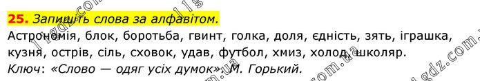 Запишіть слова за алфавітом. Астрономія, блок, боротьба, гвинт, голка, доля, єдність, зять, іграшка, кузня, острів, сіль, сховок, удав, футбол, хмиз, холод, школяр. Ключ: «Слово — одяг усіх думок». М. Горький.