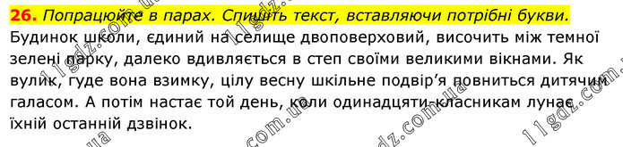 Попрацюйте в парах. Спишіть текст, вставляючи потрібні букви. Будинок школи, єдиний на селище двоповерховий, височить між темної зелені парку, далеко вдивляється в степ своїми великими вікнами. Як вулик, гуде вона взимку, цілу весну шкільне подвір’я повниться дитячим галасом. А потім настає той день, коли одинадцяти-класникам лунає їхній останній дзвінок.